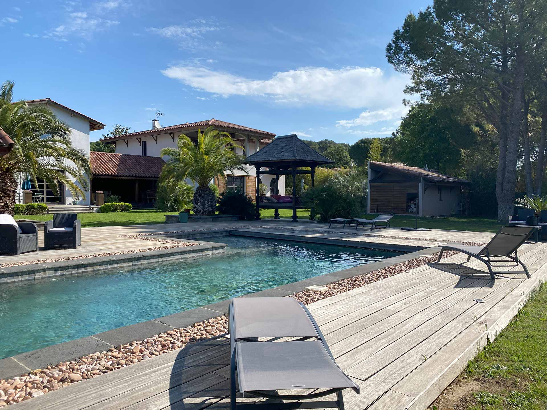 Agréable piscine extérieure en saison avec sa terrasse, poolhouse et gazebo